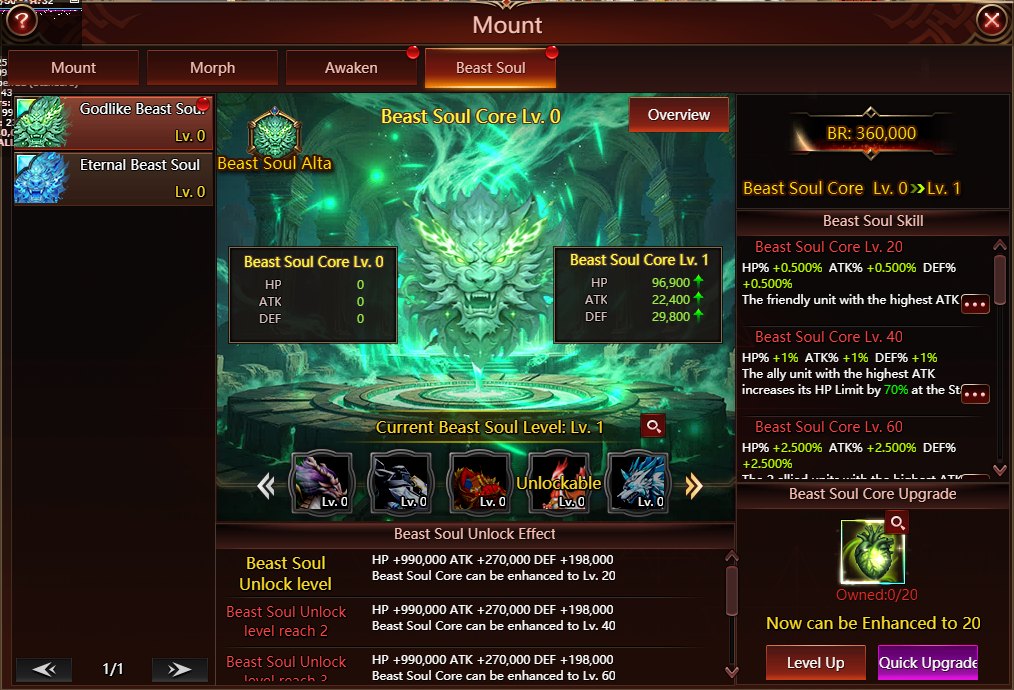Lv.1: HP +1320000; ATK +360000; DEF +264000; Beast Soul Core can be enhanced to Lv.20.